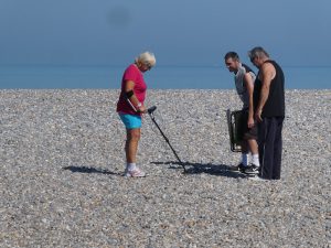 Eine Dame ist mit ihrem Metalldedektor auf der Suche nach verborgenen Schätzen.