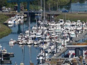 Als wir beim Sportboothafen vorbei kommen, sieht man die Boote kaum, so tief ist der Wasserstand.