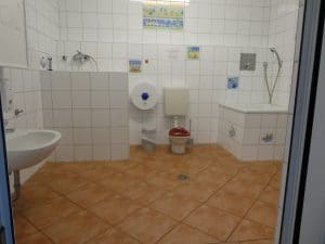 Im Sanitärgebäude hat man sogar an den Campernachwuchs gedacht: Kinderwaschbecken, Kinderklo, Babybadewanne und Dusche auf Mami’s „Arbeitshöhe“. Das haben wir bisher noch nie gesehen.