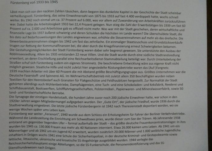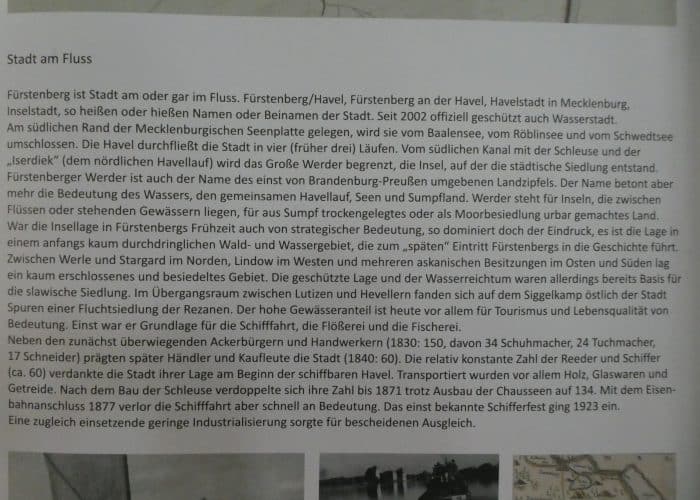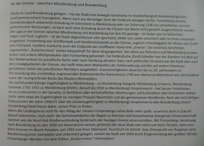 Von der 725 Jahrfeier der Stadt Fürstenberg stehen hier noch einige sehr interessante Tafeln über die Geschichte und Entwicklung. Einmal (ganze 600 Jahre) zu Mecklenburg gehörend, wurde der Ort 1990 zu einem Teil von Brandenburg.