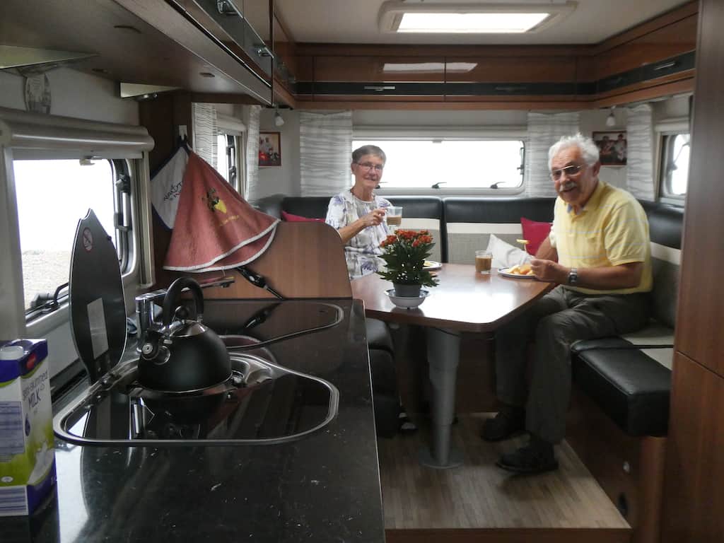 Als wir dann um 9:30 Uhr bei unserem Apfel-Frühstück sitzen, ist der Blick auf’s Wasser immer noch regengetrübt. Gegen Mittag glauben wir nicht mehr an eine Wetterbesserung, um heute hier etwas unternehmen zu können. Wir fahren weiter.