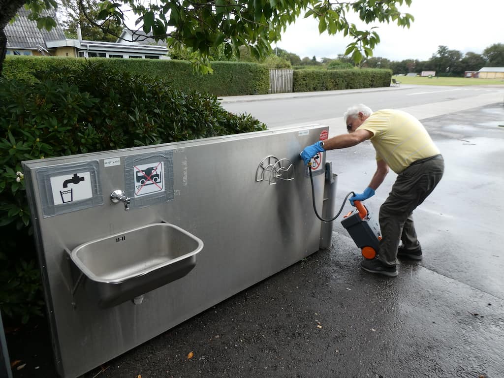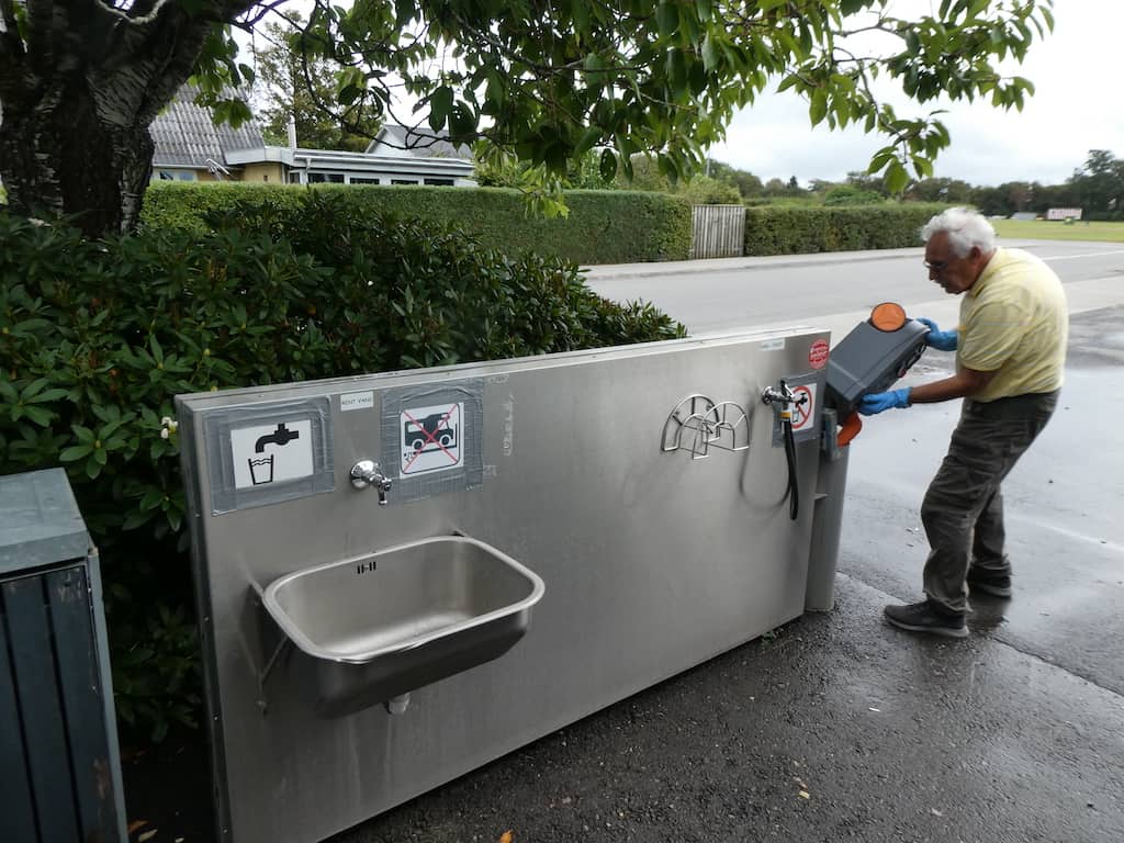 Hier finden wir eine saubere V&E-Anlage, bei der das Frischwasser und die Entsorgung genügend Abstand voneinander haben. Das ist leider oft nicht so hygienisch gut gelöst.
