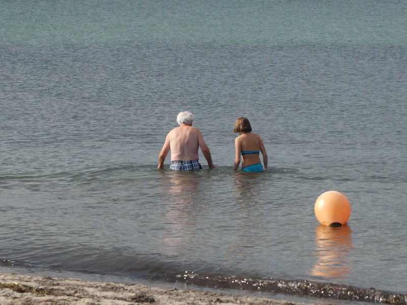 Alina und Opa gehen in der Ostsee baden. Das Wasser ist angenehm warm (wir haben immer noch kein Badethermometer).