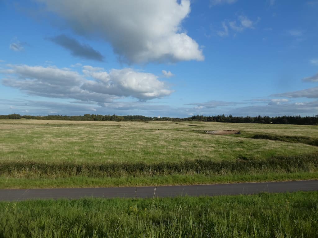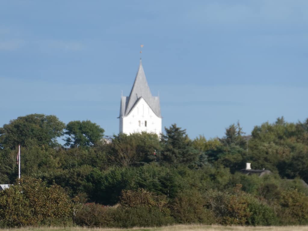 Später spazieren wir endlos auf dem Deich entlang. Die Häuser von Egebæk liegen versteckt hinter den Bäumen. Nur der Kirchturm ist zu sehen.