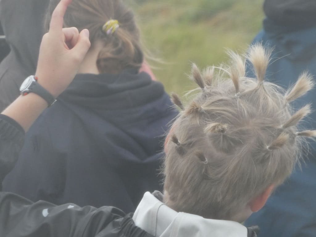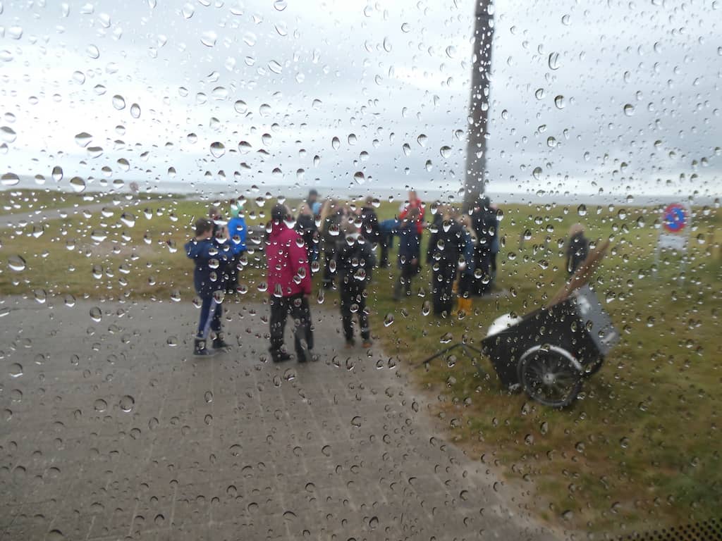 Schon früh kommt eine Schulklasse zu einer Wattwanderung. Interessant: der Typ mit der ausgefallensten Haarpracht beantwortet die meisten Fragen der Lehrerin.