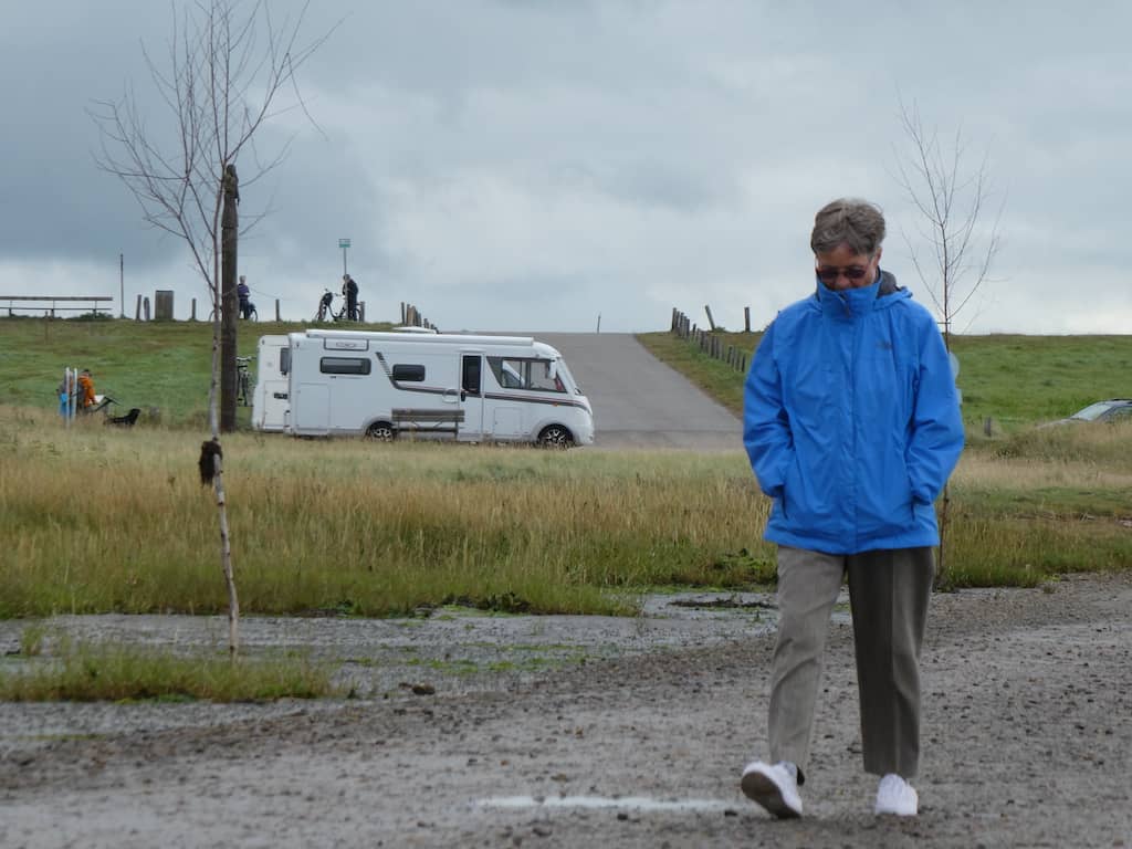 Wir merken aber schnell, dass dies mit den flachen Schuhen keine gute Idee ist. Also, das gleiche nochmal, aber jetzt mit Gummistiefeln. Michael testet, ob Renate wohl ein Schlammbad schätzen würde?