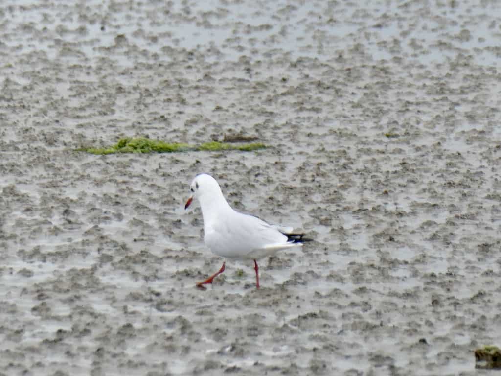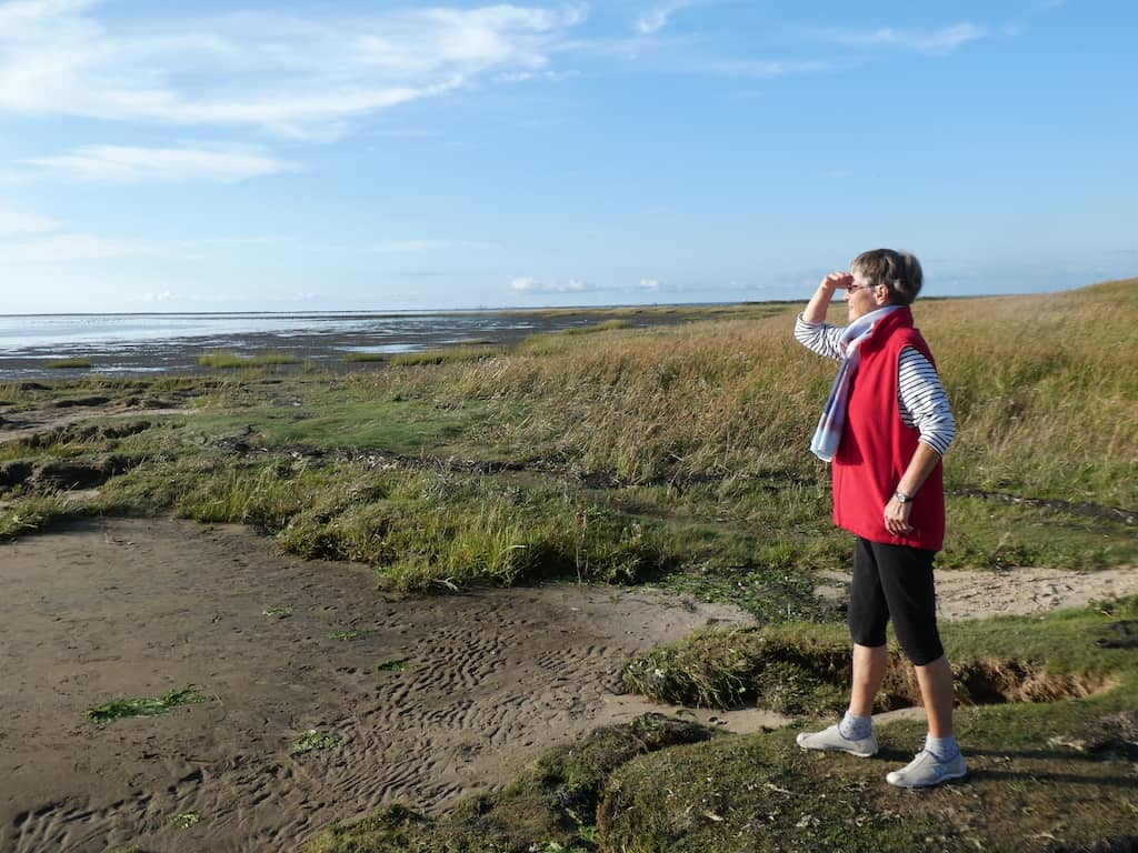 Als der Regen nachlässt, machen auch wir uns auf zum Watt. Zuerst noch mit den offenen Gummischuhen. Daneben eine Möwe im Gleichschritt mit Renate.