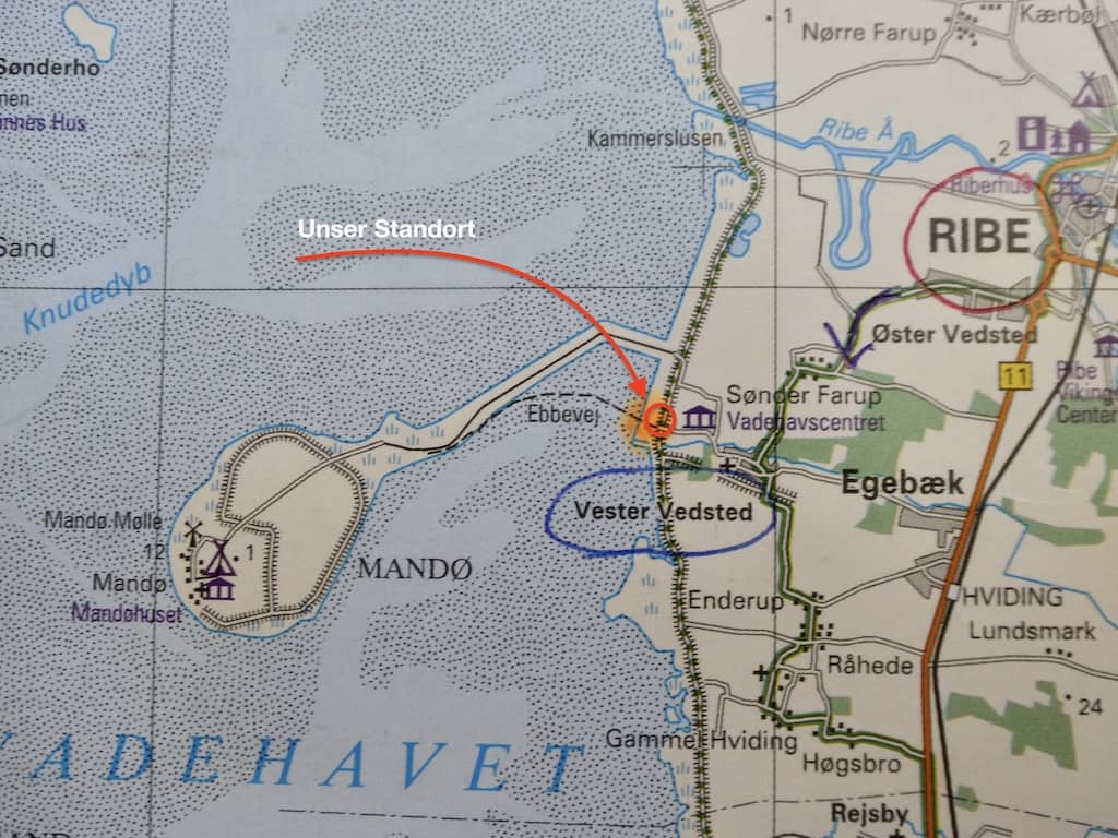Von hier führt ein Weg, der Ebbevey, hinüber auf die vorgelagerte Halbinsel Mandø. Wir danken Bo für die Detailkarten von Dänemark.