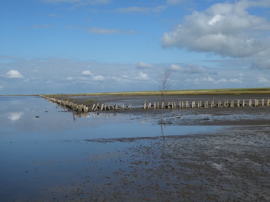 Man kann sehen, wie weit das Wasser bei Flut gekommen ist. Wattwürmer sind auch schon bei der Arbeit.