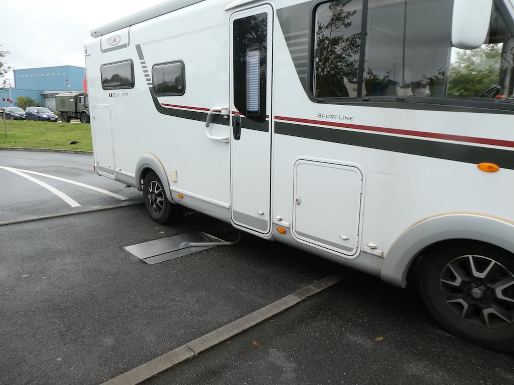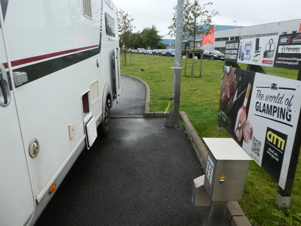 Der hat eine sehr vorbildliche Servicestation: ein Schacht in der Mitte für das Grauwasser, auf der richtigen Seite die Toilettenentsorgung und in vernünftigem Abstand das Frischwasser.