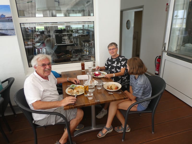 Nun fahren wir an die Elbe zum Essen ins Restaurant an der Schiffbegrüssungsstation.