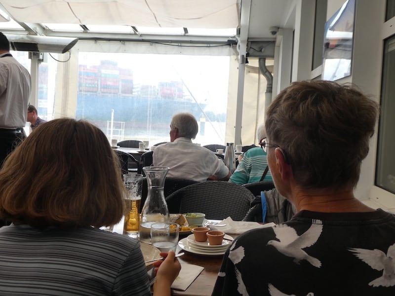 Wir bekommen zwar einen guten Tisch, aber die Aussicht auf die Elbe durch diese Plastikfenster ist doch recht getrübt. Jedes vorbeifahrenden Schiffe wird mit der Nationalhymne begrüsst und vorgestellt. Heute sind es nur einige grosse Containerschiffe.