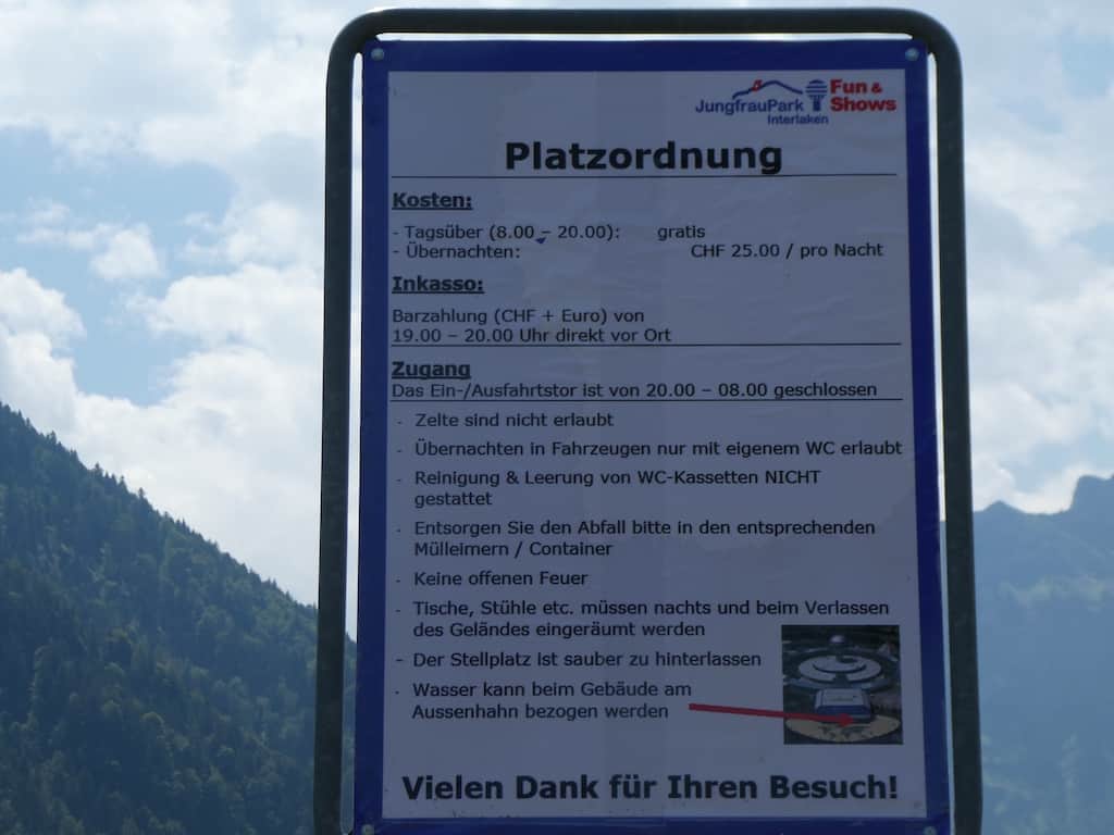 Camper dürfen hier beim JungfrauPark übrigens tagsüber kostenlos parken. Das Übernachten kostet dann aber 25 Franken !! Wohlgemerkt für nüchterne Asphalt-Romantik, ohne Entsorgung oder Strom. – No comment! –