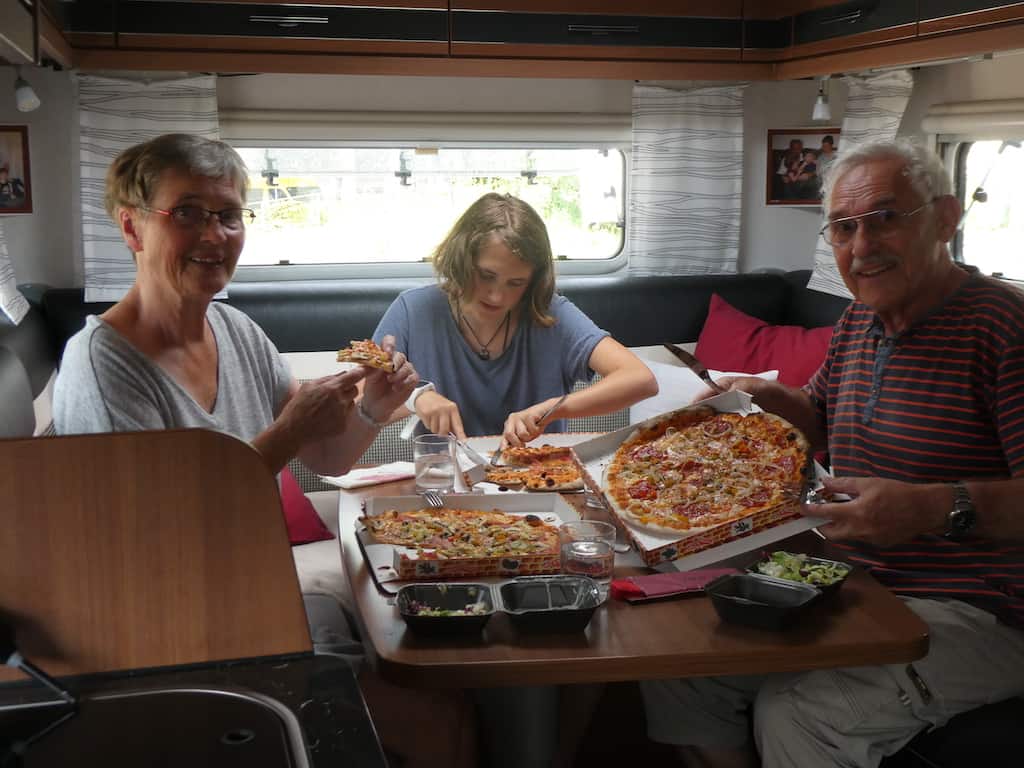 In der Not landen wir in einer Pizzeria. Die riesigen Pizzen, – sie hatten statt 30 cm einen Ø von 35 cm -, passen auf keinen unserer Teller. Wir müssen sie aus der Verpackung essen. Obwohl die Pizza ausgezeichnet war, bewältigen Oma und Opa nur die Hälfte.