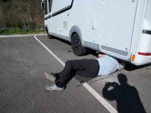 Erstmals seit Monaten hatten wir gestern die Heckstützen ausgefahren, damit der Mobi ruhiger im Wind steht. Prompt liess sich eine Stütze nicht mehr hochkurbeln. So etwas Blödes. Da muss Opa unters Auto und das Teil hochbinden.