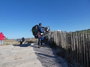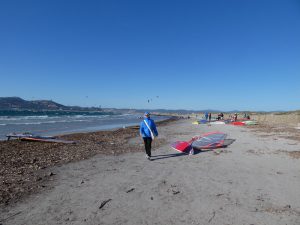 Dieser Kiter, auch nicht mehr der jüngste, macht sich mit dem Fahrrad nachhause. Ein Drachen im Rucksack vorne, einer auf dem Rücken und das Board unterm Arm. Cool!