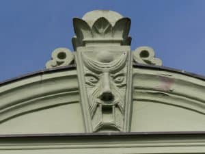 Die Sonnenapotheke (in der Sonne) mit dem schielenden Sonnenkönig auf dem Giebel.