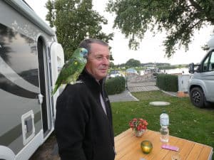 Der Nachbar kann seinen Papagei „Jakko“ auch im Freien mitnehmen. Allerdings hat die Platz-Katze schon lange ein Auge auf ihn geworfen.