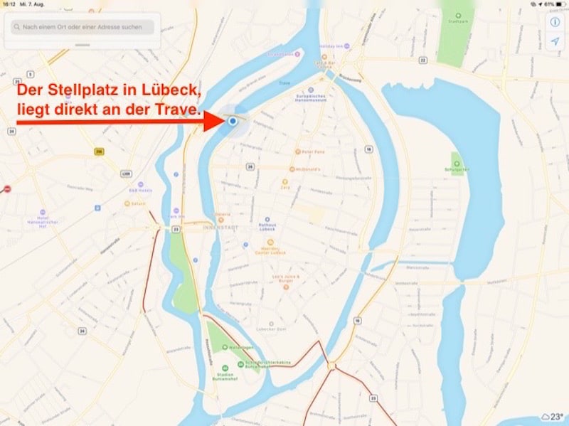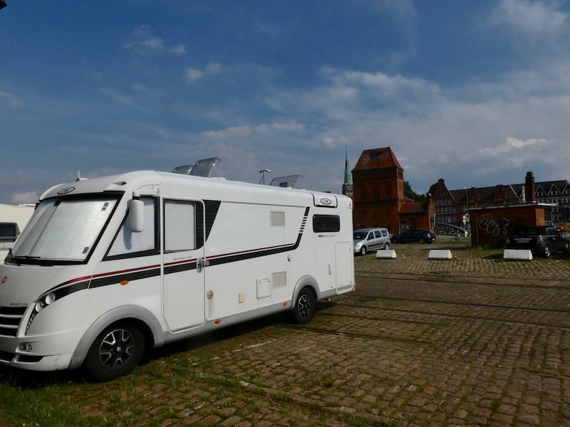 Der Stellplatz in Lübeck liegt auf einem alten Hafengelände an der Trave.