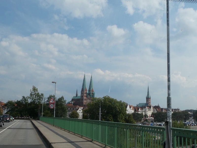 Die ersten der vielen Türme von Lübeck tauchen auf.