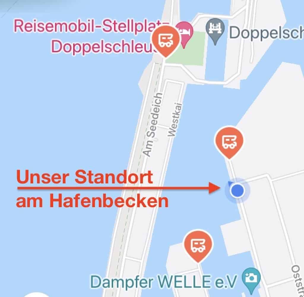 Beim letzten Mal standen wir in Bremerhaven bei der Doppelschleuse eigentlich gut. Da wir aber heute keine Infrastruktur benötigen, wählen wir den Stellplatz am Hafenbecken. 20 weitere Reisemobile stehen abends auch hier.