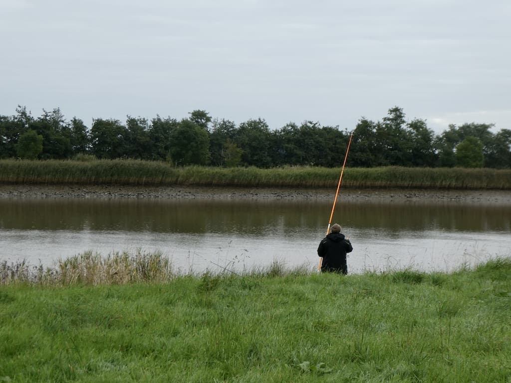 Der Tag beginnt bedeckt. Ein einsamer Angler versucht sein Glück bei Niedrigwasser an der Oste.