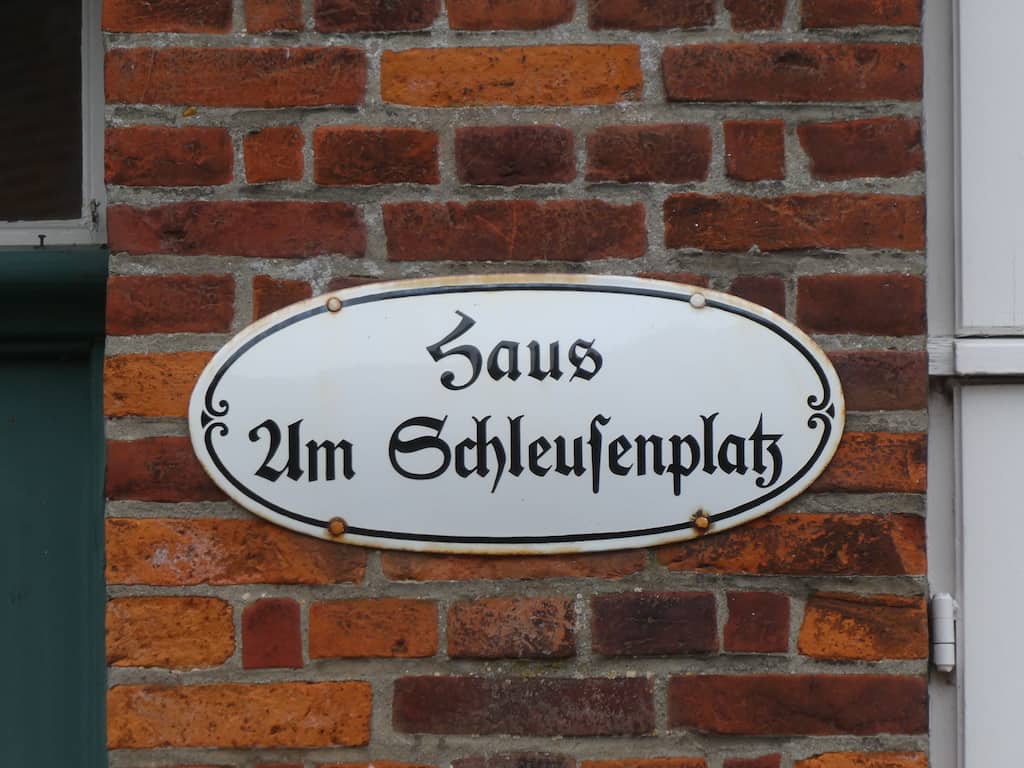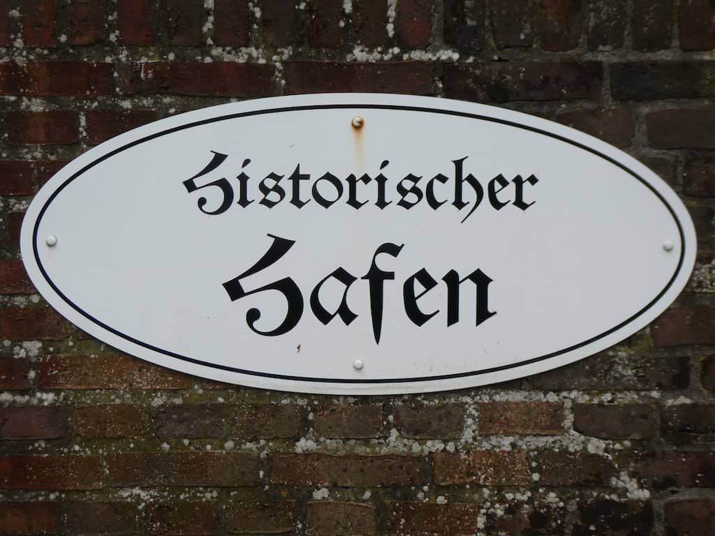 Die historischen Sehenswürdigkeiten sind alle mit Frakturschrift auf alten Emaille-Schildern beschriftet.