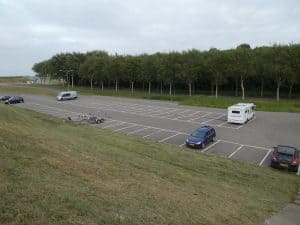 Nachdem wir die beiden zu ihrem Boot gebracht haben, wollen wir zuerst auf diesem Parkplatz beim Hafen übernachten. Es ist hier kein Übernachtungsverbot für Camper. Aber da das Übernachten in den Niederlanden generell verboten ist und eine Busse von 160 Euro nach sich ziehen kann, entscheiden wir uns doch für einen Stellplatz.