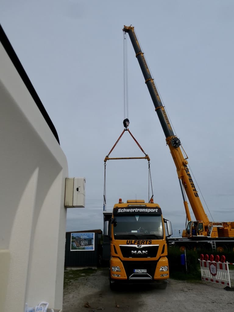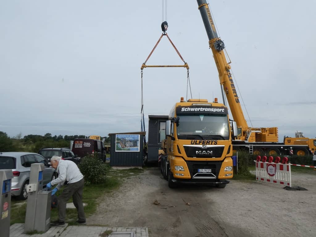 Zum Entsorgen fahren wir kurz zurück zum offiziellen Stellplatz. Das Verladen des Wohnbootes ist hier immer noch im Gange.