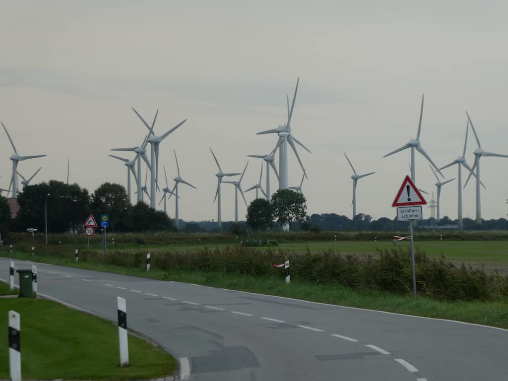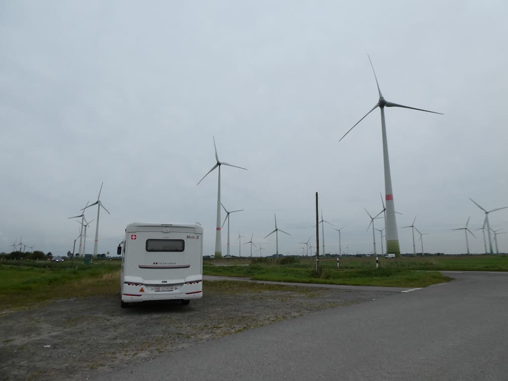 Was uns hier in Ostfriesland besonders auffällt, sind die vielen Windturbinen. In der Nähe von Dornum zählen wir deren 190 ringsum. 150 Meter hoch ragen sie in den Himmel und sorgen für sauberen Strom.
