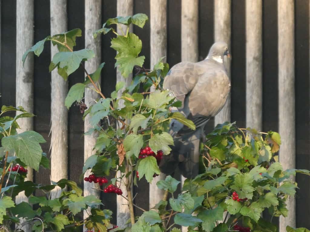 Beim Abendessen kommen uns noch zwei Ringeltauben vor die Linse, wie sie geschickt die Beeren aus den Büschen schnabulieren.