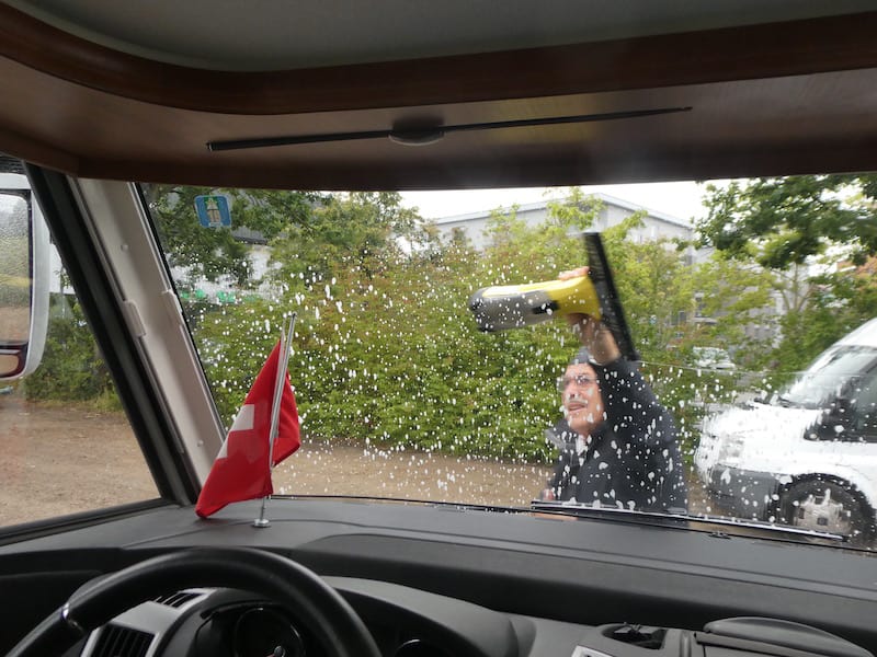 Unser Kärcher geht nach einem satten Schlag auf’s Gehäuse auch wieder (der Motor war blockiert). Damit ist das Scheibenreinigen sogar im Regen ein Genuss.