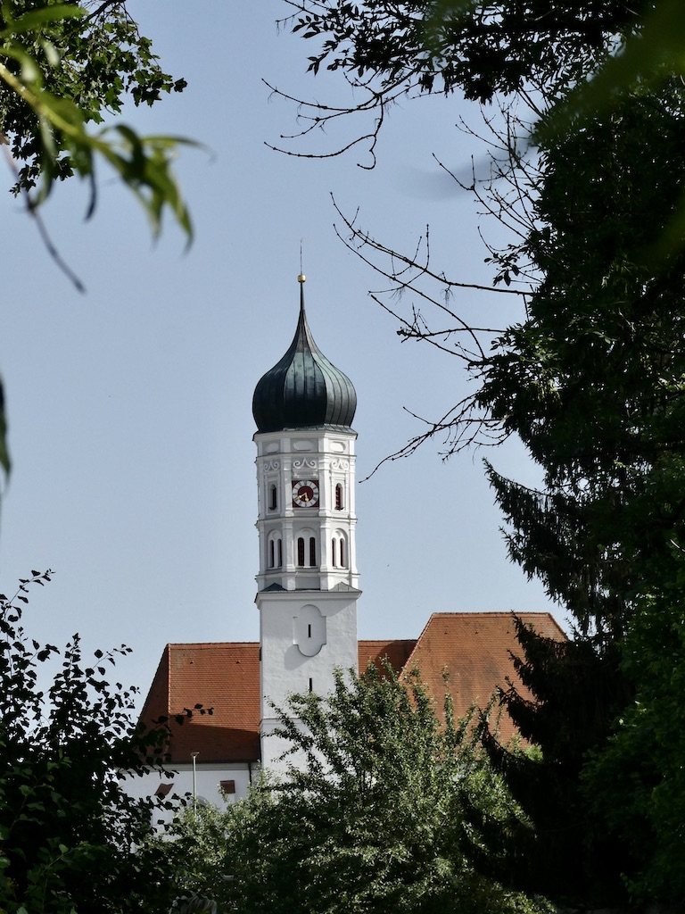 Gleich hinter dem Campingplatz fliesst die Kammel, ein kleines Flüsschen, nach dem dieses Gebiet benannt wird. Von hier haben wir den Blick auf die Klosterkirche Ettenbeuren.