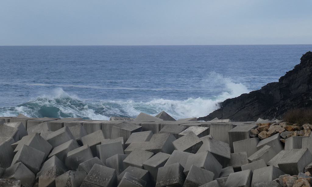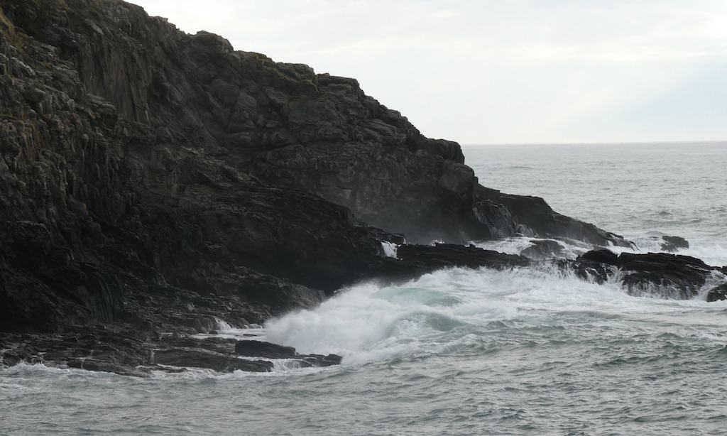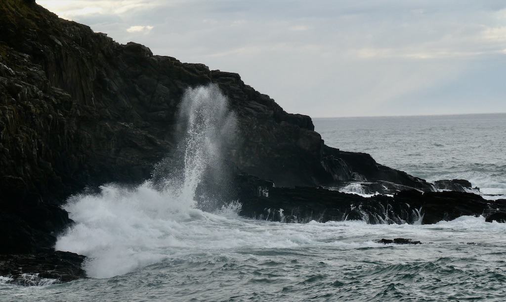Obwohl kein sehr hoher Seegang herrscht, spritzt das Wasser spektakulär an den Felsen neben der Hafenmole.