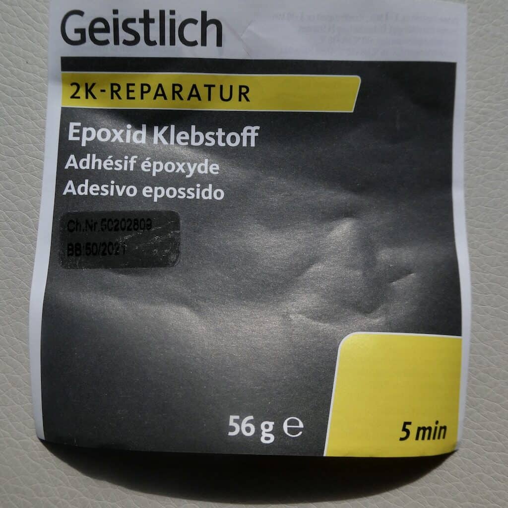 Mit 2-Komponenten-Klebstoff aus unserer Werkzeugschublade kann der Schaden rasch (für’s erste) behoben werden und die Fahrt kann weitergehen.