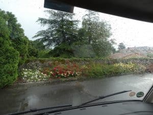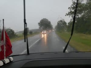 Es wird dunkler und dunkler. Später fahren wir in ein sehr starkes Gewitter mit Regen. Die Sicht wird grenzwertig schlecht, so halten wir auf einem Parkplatz an.