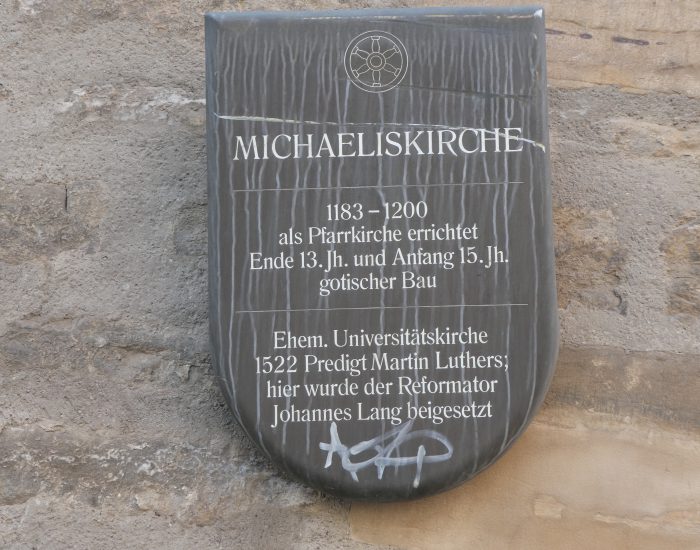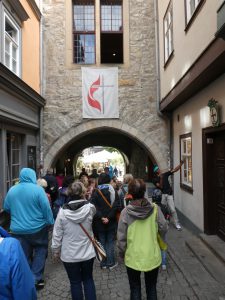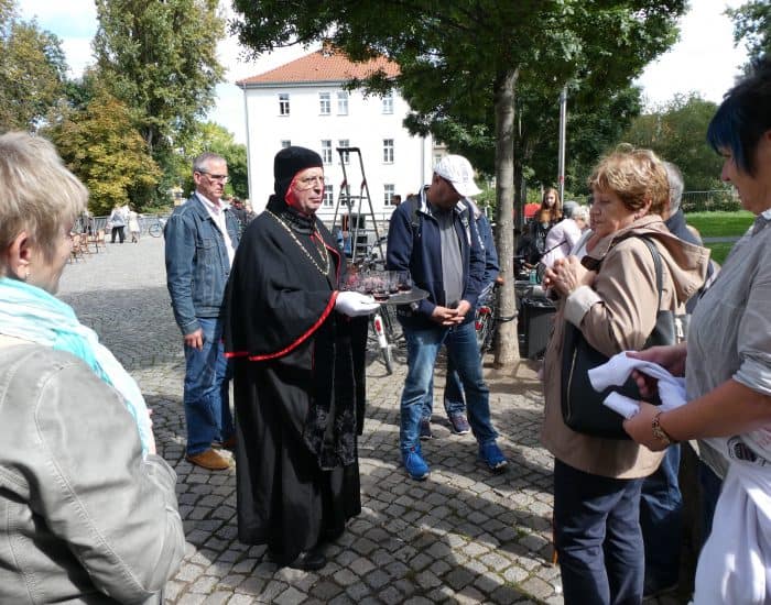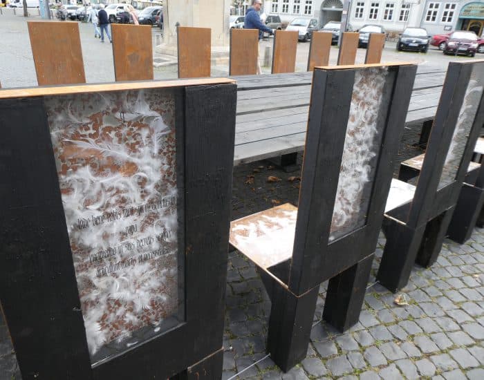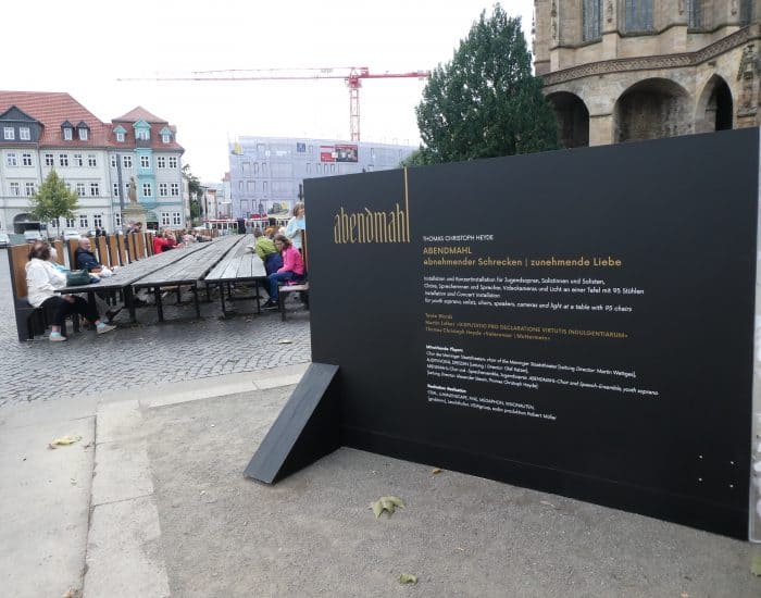 Auf dem Domplatz steht ein 42 Meter langer Tisch mit 95 Stühlen. Dies ist ein Teil des transmedialen Kunstwerkes in Erfurt, Leipzig und Wittenberg im Zusammenhang mit dem Reformationsjubiläum.