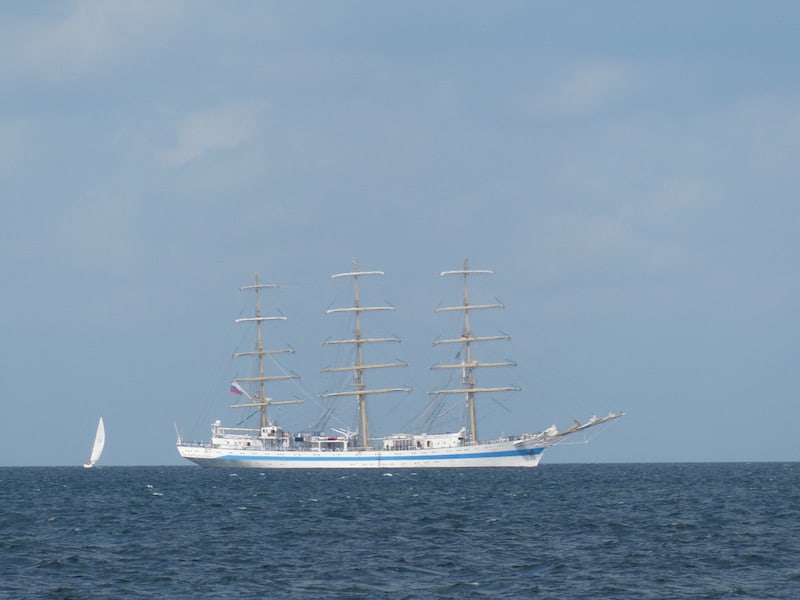 In der Ferne fährt die „MIR“, der russische Dreimaster, von Wismar kommend, östlich weiter. Leider hat er keine Segel gesetzt, obwohl er optimalen achterlichen Wind hätte. Er wird wohl seine Gründe haben.
