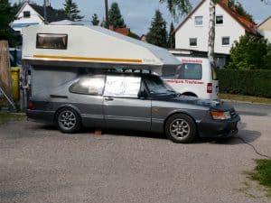 Ein Dachaufsatz auf einem alten Saab. Damit würden wir dann doch nicht wochenlang unterwegs sein wollen.