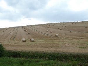 Die Strohballen scheinen jeden Moment hinunterzurollen.