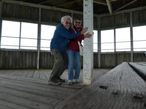 Erst zum Schluss geht unser Blick durch die Spalten im Bretterboden nach unten ins Freie. Kein angenehmes Gefühl!