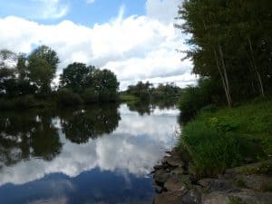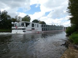 Bald kommt schon das erste Schiff vorbei. Ein Flusskreuzfahrtschiff. Ja, sogar eines mit der Schweizer Fahne und Heimathafen Basel. Der Main ist hier noch sehr schmal.