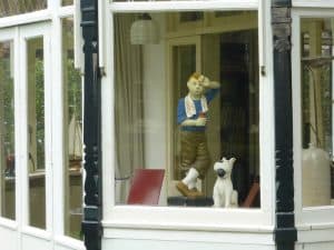 Und aus einem Fenster schauen uns Tim und Struppi nach.
