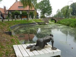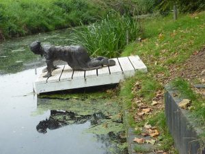 In diesem kleinen Ort erfreut uns eine lustige Skulptur am Wasser.