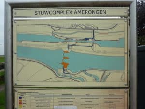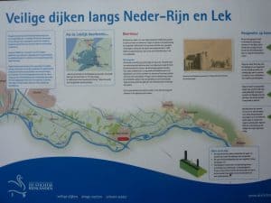 Der Niederrhein und Lek sind schon um 16 Meter gestiegen. Der Damm brach letztmals 1751. Im Jahr 1624 stand das Hochwasser sogar bis Amsterdam (blaue Fläche).