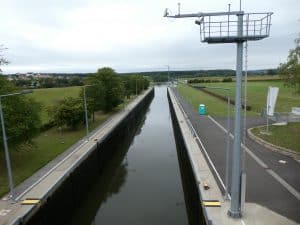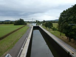 Bei dieser Gelegenheit fuhren wir noch zur nächsten Mainschleuse bergwärts nach Knetzgau. Der Main macht hier einen natürlichen Bogen. Eine Staustufe mit Wasserkraftwerk versperrt den Weg. Die Schleuse für die Schifffahrt liegt in der „Sehne“. Aber es war nix los!