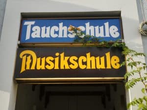 Eine ungewöhnliche Kombination: Tauchschule sowie Musikschule. Ob sie wohl was taucht?!
