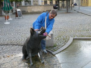 Renate füttert das Glücksschwein. Das kann nie schaden.