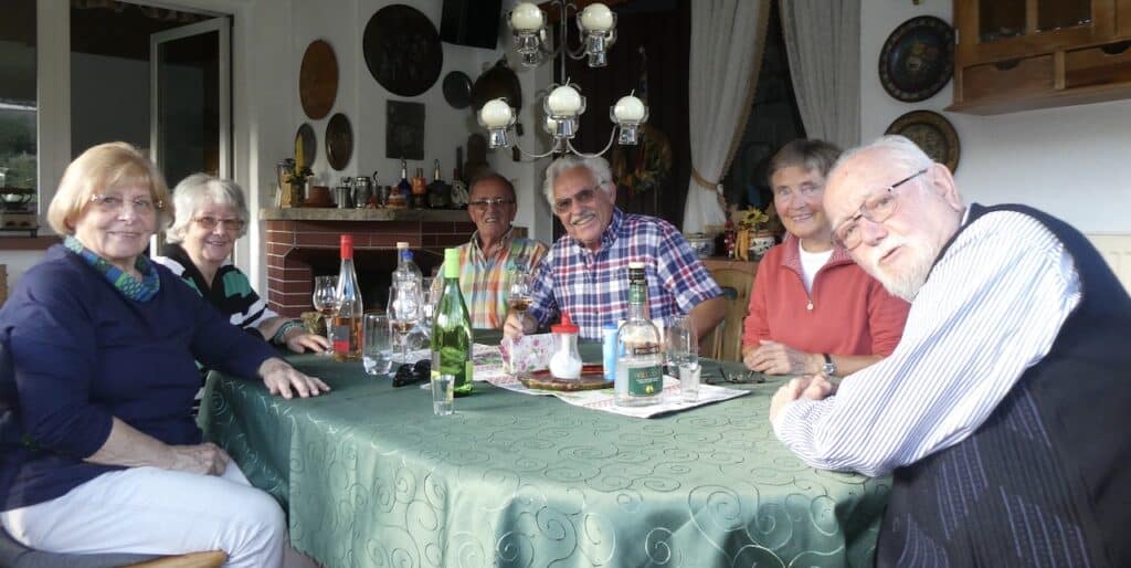 Gisela, zweite von links, war eine «Vorzeige-Klavierschülerin» von Michaels Vater. Wir haben uns etwa 65 Jahre nicht mehr getroffen. Bei Kaffee und Kuchen und dem einen und anderen Gläschen und auch Glas werden viele alte Erinnerungen ausgegraben. – Die am Rand des Bildes sitzenden Personen mögen die unvorteilhafte Optik des Weitwinkels entschuldigen. Ihr seid wirklich nicht so korpulent, wie das hier scheint.