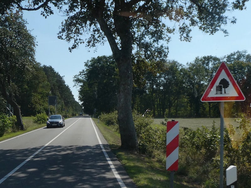 Auf unserer Überlandfahrt nach Parchim werden wir laufend vor Bäumen gewarnt, die ab und zu bedrohlich über die Fahrbahn ragen. Davor haben wir mit unserer Höhe auch Respekt.